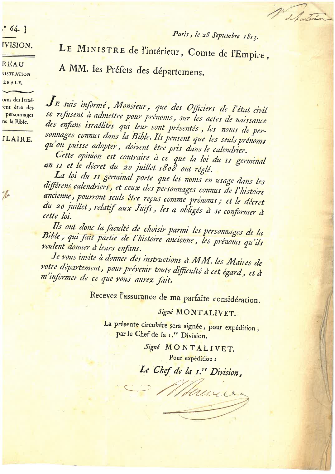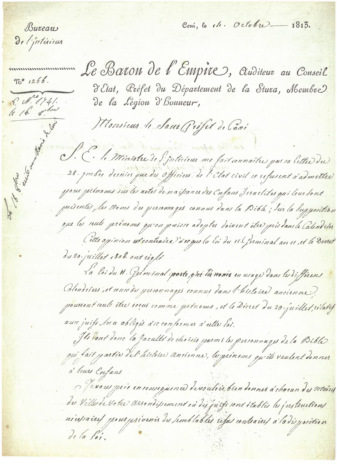 1_ Dip. Della Stura, faldone 175a, fascicolo 39, Circolare Ministro de l’Interieur – In questa circolare proveniente dal Ministero de l’Interieur di Parigi del 1813, durante il periodo di annessione francese del Piemonte, viene chiarita la legittimità dell’utilizzo dei nomi provenienti dall’Antico Testamento, con particolare riferimento a episodi in cui gli ufficiali dello Stato Civile si erano rifiutati di iscrivere questi nomi sui certificati di nascita.