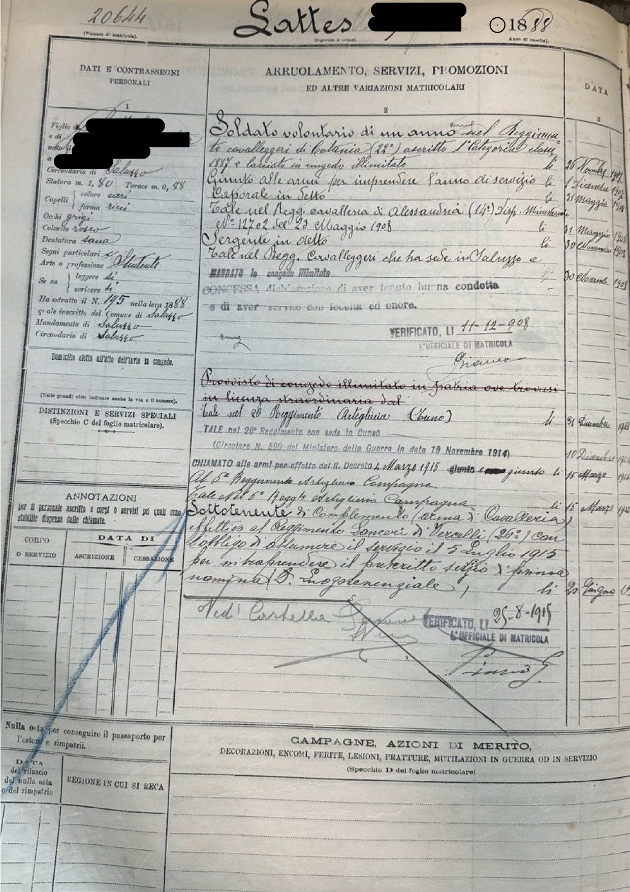 3_Distretto militare di Cuneo, registri dei fogli matricolari, 1887, Cat. I, Foglio Matricolare di Lattes [omissis] – Durante la Prima Guerra Mondiale i membri della Comunità ebraica hanno partecipato allo sforzo bellico allo stesso modo del resto della popolazione, anche come ufficiali e sottoufficiali, segno della piena accettazione, in questo periodo, degli Ebrei come parte a pieno diritto della comunità nazionale.