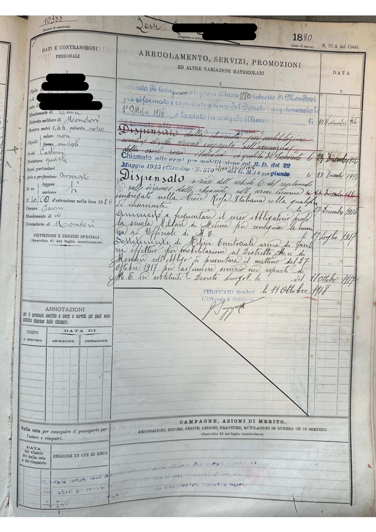 4_Distretto Militare di Mondovì, registri dei fogli matricolari, 1880, Cat. I, Foglio Matricolare di Levi [omissis] – Anche esponenti delle Comunità ebraiche facenti riferimento al Distretto militare di Mondovì, come quelle del Cuneese, sono stati partecipi dello sforzo bellico.
