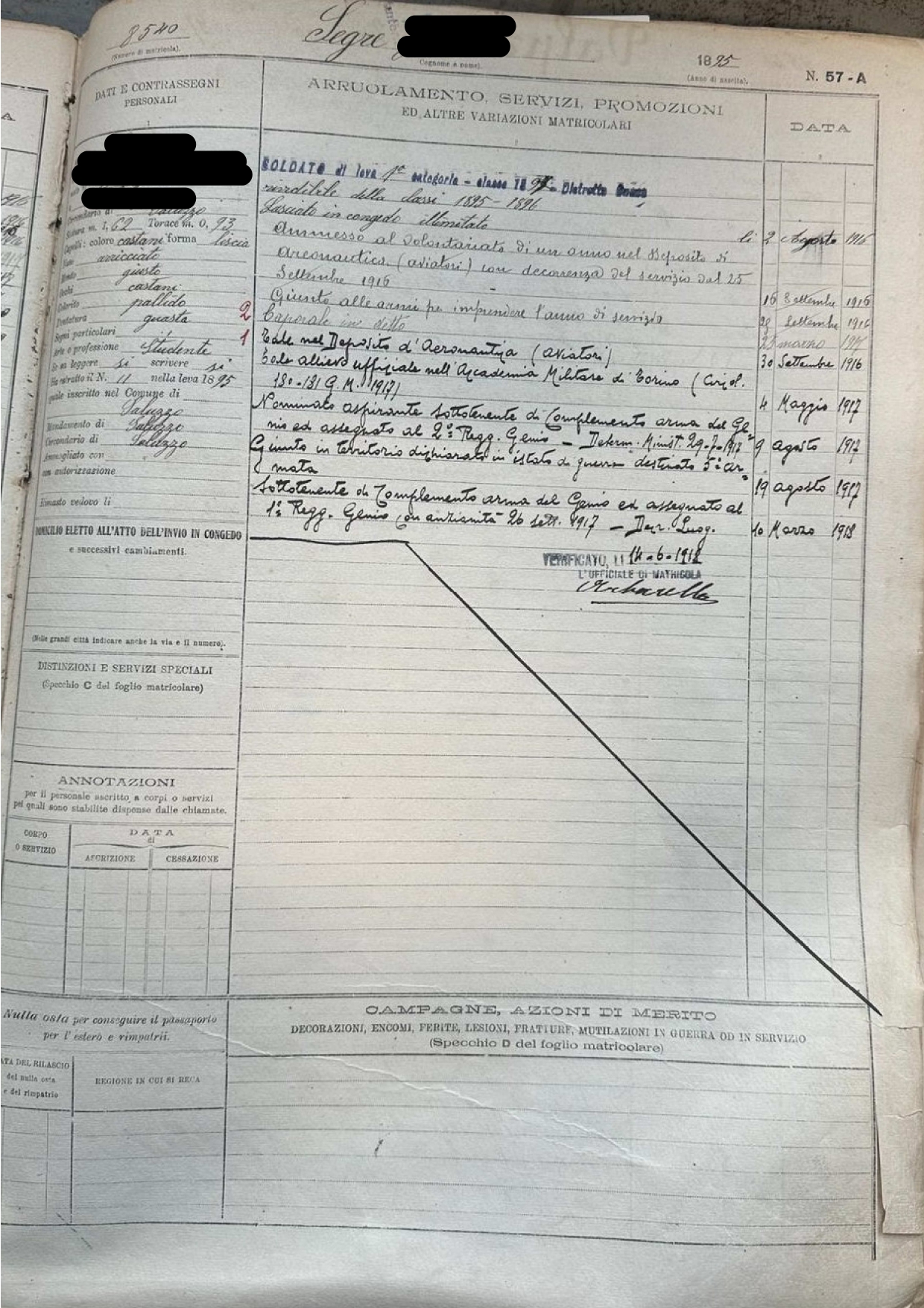 5_Distretto militare di Cuneo, registri dei fogli matricolari, 1897, Cat. I, Foglio Matricolare di Segre [omissis] – In questo caso si tratta di un volontario, che testimonia l’entusiasmo e la partecipazione delle Comunità ebraiche alle tragiche vicende della Grande Guerra in un’arma nuova come l’aviazione, che al tempo stava emergendo come nuova frontiera della tecnica militare.
